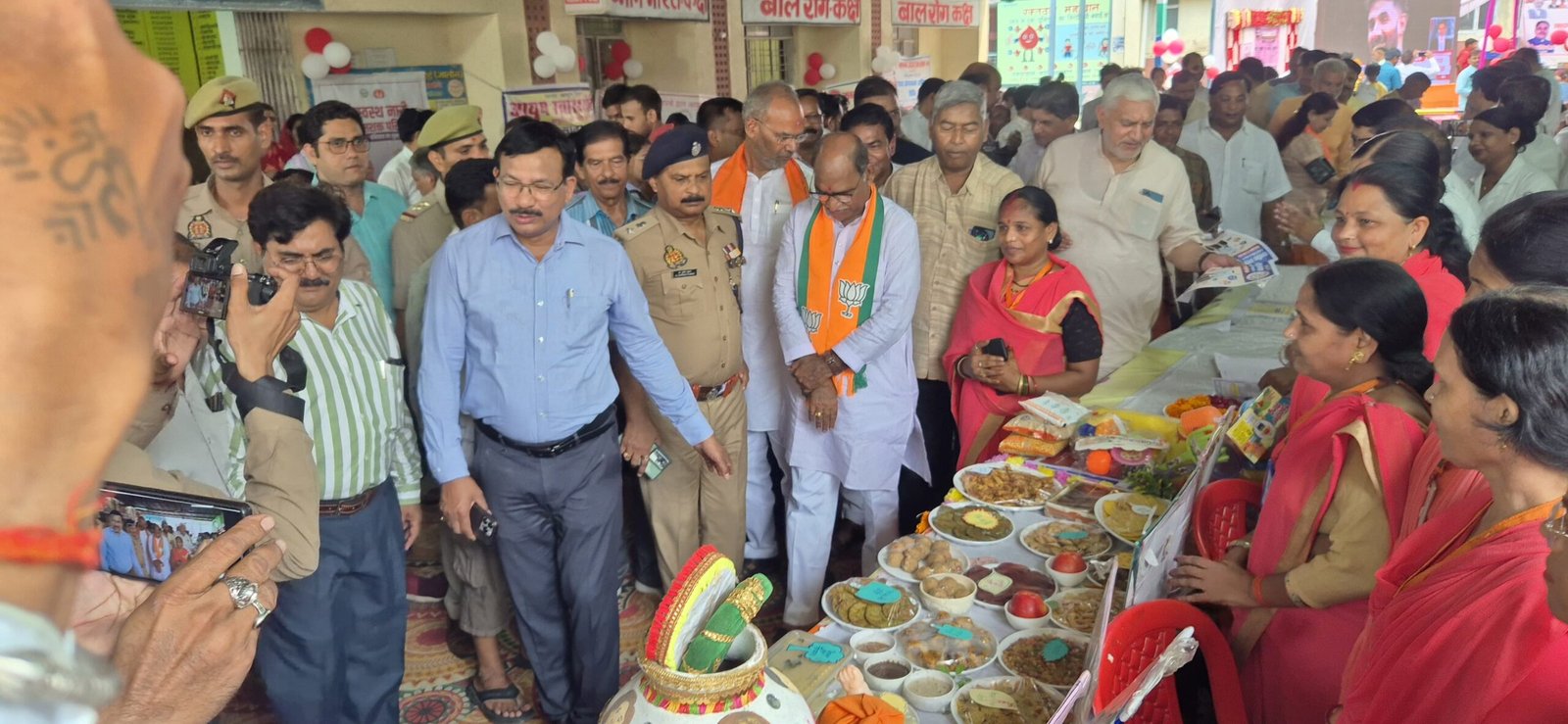 इस अवसर पर मा० जिला पंचायत अध्यक्ष डॉ. घनश्याम अनुरागी, सदर विधायक गौरीशंकर वर्मा, माधौगढ़ विधायक मूलचंद निरंजन, कालपी विधायक विनोद चतुर्वेदी, जिलाधिकारी राजेश कुमार पाण्डेय, पुलिस अधीक्षक डॉ. दुर्गेश कुमार, जल शक्ति मंत्री के प्रतिनिधि अरविन्द चौहान, पूर्व विधायक नरेंद्र पाल सिंह जादौन तथा भाजपा जिला अध्यक्षा उर्विजा दीक्षित ने संयुक्त रूप से फीता काटकर प्रदर्शनी का उद्घाटन किया।