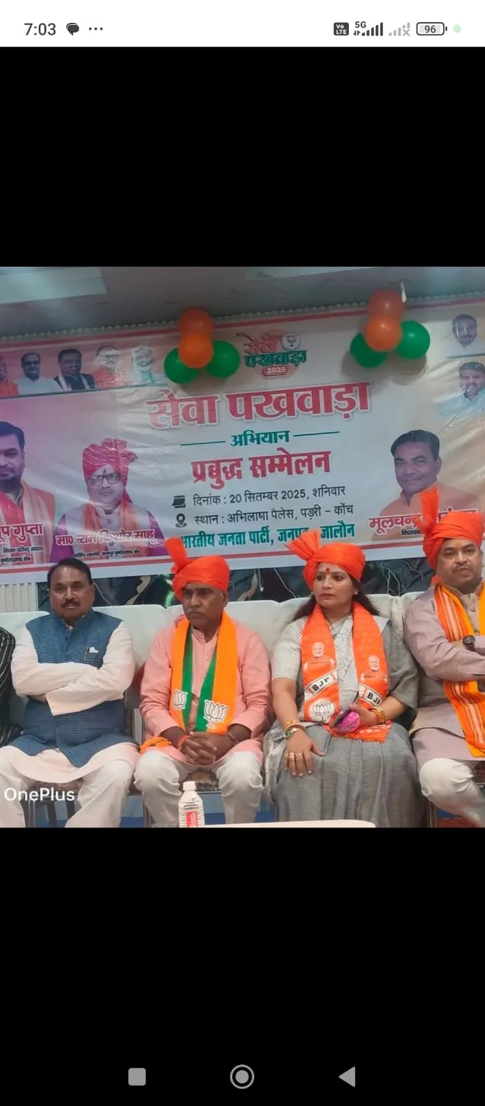 कोंच। उरई रोड पर स्थित अभिलाषा पैलेस में भारतीय जनता पार्टी के सेवा पखवाड़ा के अंतर्गत जिला स्तरीय प्रबुद्ध वर्ग सम्मेलन का आयोजन किया गया इस सम्मलेन में मुख्य अतिथि भारतीय जनता पार्टी के महामंत्री और विधान परिषद सदस्य अनूप गुप्ता विशिष्ट अतिथि उरई सदर विधायक गोरी शंकर बर्मा मंत्री प्रतिनिधि अरविंद्र सिंह चौहान विधायक मूलचंद्र निरंजन जिला सहकारी बैंक के सभापति ब्रज भूषण सिंह मुन्नू जिला पंचायत अध्यक्ष घनश्याम अनुरागी नगर पालिका अध्यक्ष प्रदीप गुप्ता भाजपा जिलाध्यक्ष उर्बिजा दीक्षित आदि मंचस्थ रहे इस सम्मलेन में अनूप गुप्ता ने कहा कि सरकार ने सभी के लिये काम किया है और आज भी कर रही है उन्होंने की सम्मलेन के साथ सरकार की जन कल्याण कारी नीतियों को जन जन तक पहुंचाने के लिये वह कार्य करें नगर पालिका अध्यक्ष प्रदीप गुप्ता ने कहा कि भाजपा की सरकार बिना भेदभाव के साथ लोगों को योजनाओं का लाभ देने आगे रही है इस सम्मेलन में जिला मंत्री बीरेंद्र सिंह निरंजन सुनील लोहिया अंजू अग्रवाल , गौरव तिवारी नरेश वर्मा सभासद परशुराम वर्मा , मयंक मोहन गुप्ता नरसिंह बुंदेला शिव प्रसाद निरंजन बब्बू, संजय लोहिया राम जी गुप्ता आकाश गुप्ता नरेश कुशवाहा पप्पू रेजा मनीष गुप्ता दीपक गर्ग अंचल गुप्ता शंभू दयाल, राजेश्वरी यादव मनीष चौधरी सहित तमाम जिले से आये पार्टी जन मौजूद रहे