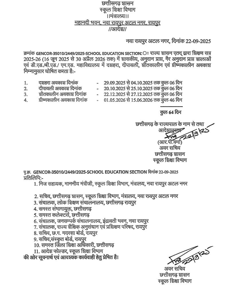 दशहरा, दीपावली, शीतकालीन एवं ग्रीष्मकालीन अवकाश की घोषणा कर दी गई है