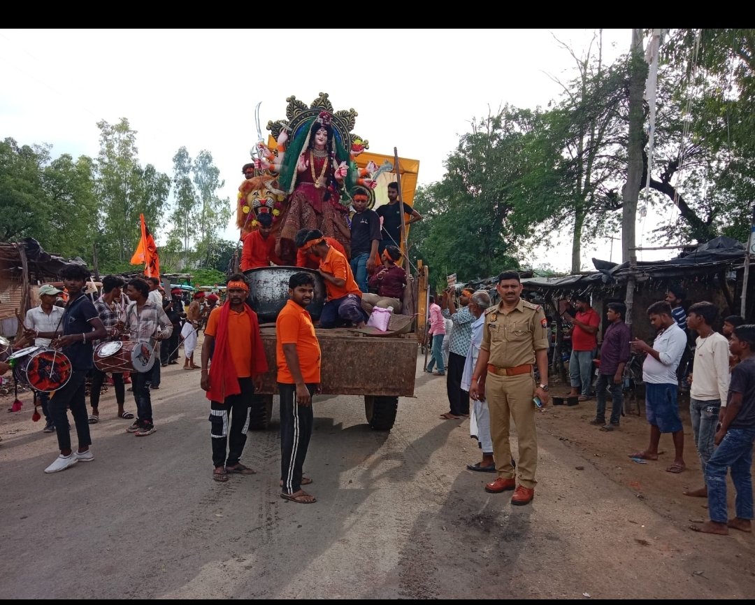 करतल/बांदा– शारदीय नवरात्रि की समाप्ति एवं दशहरा पर्व मनाने के बाद आज ग्राम पुकारी, शंकर बाजार एवं आसपास के ग्रामों में नवरात्रि के समय भक्तों द्वारा रखी गयीं माँ दुर्गा प्रतिमाओं के देवी भक्तों ने मां आदिशक्ति की प्रतिमाओं को ट्रेक्टर ट्राली में भव्य झांकी सजाते हुये गाजे बाजे के साथ समूचे ग्राम में शोभायात्रा निकाली जिसमें जगह जगह पर स्थानीय लोगों ने माँ के दर्शन कर फूल मालायें अर्पित कर आरती उतारते हुये माता का आशीर्वाद लिया! शोभायात्रा के दौरान सभी भक्तों ने एक दूसरे को अबीर, गुलाल लगाकर बधाइयाँ दी इसके उपरान्त समूची कमेटियों के भक्तों ने रंज नदी पहुंचकर श्रद्धा पूर्वक विधि विधान के साथ माता की पूजा अर्चना कर नदी की बीच जलधारा में सभी प्रतिमाओं का विसर्जन किया! समूचे कार्यक्रम के दौरान चौकी प्रभारी अरबिंद कुमार सिंह मय सहयोगी पुलिस कर्मियों के साथ मुस्तैद रहे जिसके चलते समूचा कार्यक्रम बड़े ही शान्ति पूर्ण ढंग से सम्पन्न हुआ!