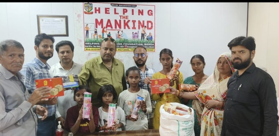 हेल्पिंग द मैनकाइंड फाउंडेशन बांदा संस्था की ओर से अलीगंज स्थित संस्था के ऑफिस से दीपावली के शुभ अवसर पर बेवा ज़रूरत मंद परिवार को राशन, मिठाई तथा बच्चो को चॉकलेट एवं गिफ्ट आदि का वितरण किया गया ताकि ज़रूरत मंद परिवार वर्ग में भी दीपावली की खुशियों को बाटा जा सके राशन, मिठाई एवं गिफ्ट पाकर ज़रूरत मंद परिवारों ने संस्था के लोगों को आशीर्वाद दिया एवं गिफ्ट पाकर बच्चों ने खुशी का इज़हार किया। आपको बताते चले इससे पूर्व संस्था की टीम के द्वारा गरीब बच्चियों की शादी में मदद,अस्पताल में फल वितरण,गरीबों को दवा इलाज ऑपरेशन में मदद, दीपावली में कपड़ा वितरण,राशन वितरण आदि ज़रूरत मंद परिवारों को सहयोग संस्था पिछले कोरोना काल लॉकडाइन से ही लगातार करती चली आ रही है और ये सिलसिला लगातार जारी है।