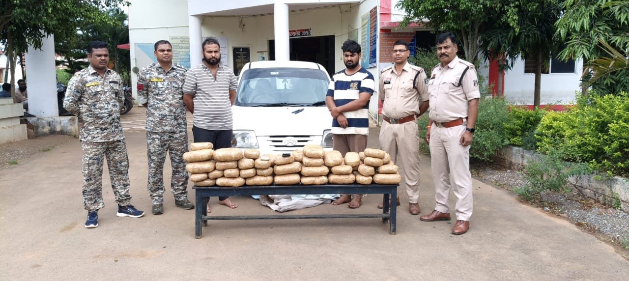 मुखबीर सूचना पर पुलिस ने दो व्यक्ति एक सफेद रंग के हुंडई सेंट्रो कार क्रं० UK-08-T-6189 में अवैध रूप से मादक पदार्थ गांजा लोडकर उड़ीसा राज्य से धनपुंजी के रास्ते जगदलपुर की ओर परिवहन कर रहा कि सूचना पर हमराह स्टाप पुलिस टीम के द्वारा ग्राम धनपुंजी फारेस्ट नाका एनएच 63 मेन रोड के पास पहुंच कर नाकाबंदी कर आने जाने वाले वाहनों को चेक रहे थे। चेकिंग दौरान सफेद रंग के हुंडई सेंट्रो कार क्रं० UK08T6189 आता दिखाई दिया जिसे रोककर चेक किये चालक का नाम पता पुछने पर अपना नाम मोहम्मद शोएब पिता बदर अली उम्र 24 वर्ष निवासी ग्राम सहसपुर मोहल्ला हकीमपुरा तह० बिजनौर थाना सिवारा जिला बीजनौर उ०प्र० बगल सीट पर बैठा व्यक्ति अपना नाम मुर्शीद पिता सैययार उम्र 35 वर्ष निवासी ग्राम मदिना कालोनी गली नम्बर 04 लिसाडी रोड मेरठ थाना लिसाडी रोड जिला मेरठ उ०प्र० का रहने वाले बताये मौके पर आरोपीयों के हुंडई सेंट्रो कार क्रं० UK-08-T-6189 का तलाशी लेने पर कार के पीछे सीट के नीचे, कार के नीचले हिस्से में बनाये गये गोपनीय चेम्बर एवं बैक लाईट के अंदर गांजा से भरा छोटा छोटा पैकेट को छिपाकर रखा था जिसे खोलकर बाहर निकाला गया इस प्रकार कुल 60 पैकेट जुमला वजन 46.375 किलोग्राम मादक पदार्थ गांजा कुल किमती 4,60,000/ रूपये को बरामद कर परिवहन में प्रयुक्त हुंडई सेंट्रो कार क्रं० UK-08-T-6189 कीमती 3,00,000/ रूपये, 02 नग एन्ड्राईड मोबाईल फोन कीमती 10,000/ रूपये एवं नगदी रकम 2100/रूपये कुल जुमला कीमत 7,72,100/ रूपये को जप्त किया गया। आरोपीयों का कृत्य अपराध धारा 20 (ख) ii (ग) एनडीपीएस एक्ट का पाये जाने से आरोपीयों के खिलाफ अपराध पंजीबद्ध कर विवेचना में लिया गया। गिरफ्तार आरोपीयों को न्यायिक रिमांड पर माननीय न्यायालय के समक्ष पेश करने रवाना किया गया है।
