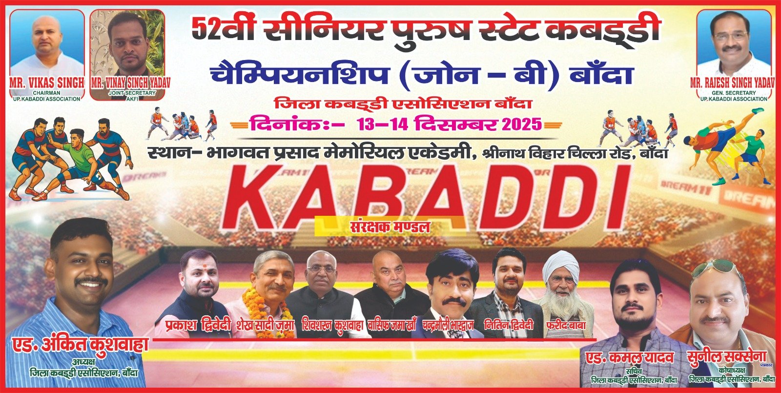 52वीं सीनियर पुरुष राज्य स्तरीय कबड्डी चैंपियनशिप (ज़ोन–बी) में सहभागिता हेतु बाँदा जिला टीम का ट्रायल आज निर्धारित कार्यक्रम के अनुसार सफलतापूर्वक संपन्न हुआ। यह प्रतियोगिता 13 से 14 दिसम्बर 2025 तक आयोजित की जाएगी।