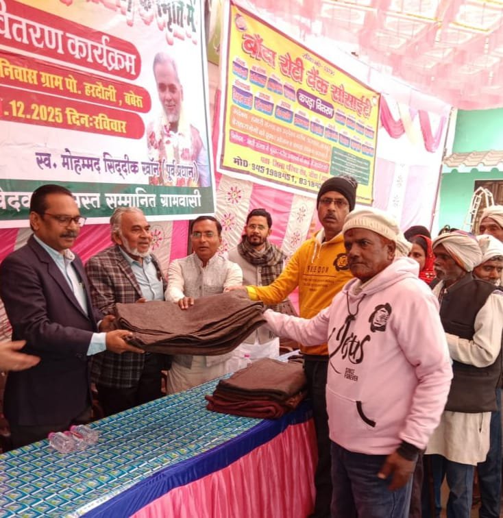 बाँदा रोटी बैंक सोसाइटी के संरक्षक शेख़ सादी जमा और बांदा रोटी बैंक सोसाइटी के सहसंरक्षक चन्द्रमौली भारद्वाज जी के संरक्षण में बाँदा रोटी बैंक सोसाइटी के अध्यक्ष रिज़वान अली की अध्यक्षता में बाँदा रोटी बैंक सोसाइटी के संगठन मंत्री सुनील सक्सेना के नेतृत्व में,पूर्व ग्राम प्रधान ग्राम हरदौली मोहम्मद शादाब जी की उपस्थिति में,समाजसेवी ग्राम हरदौली सैफुल्लाह 200 कम्बल के विशेष सहयोग से बाँदा शहर के जिम्मेदार जागरूक लोगों के द्वारा दान में दिए गए कम्बल, कपड़े,जूते चप्पल आदि का वितरण ग्राम हरदौली ब्लॉक बबेरू तहसील बबेरू जनपद बाँदा के जरूरतमंद ग्रामीणों को किया गया तथा साथ ही ग्रामीणों को सर्पदंश, स्वास्थ्य,स्वच्छता तथा उनके कानूनी अधिकारों के प्रति बाँदा रोटी बैंक सोसाइटी की टीम की महिला महामंत्री रिया खान और उपाध्यक्ष मोहम्मद सलीम के द्वारा जागरूक किया गया,समाजसेवी सैफ़ उल्लाह ने सभी का आभार व्यक्त किया। उक्त कम्बल,कपड़े आदि पाकर ग्रामवासियों में अपार खुशी दिखाई दी सभी लोगों को दुआओं और आशीर्वाद से नवाजा उक्त कार्यक्रम में मुख्य अतिथि के रूप में डॉ0 अजय कुमार ए0सी0एम0ओ0 बाँदा, विशिष्ट अतिथि डॉ0मक़सूद नेत्र विशेषज्ञ,डॉ0 अनस दन्त रोग विशेषज्ञ, बाँदा रोटी बैंक से कार्यालय प्रभारी मोहम्मद शमीम,उपाध्यक्ष मोहम्मद सलीम, शाखा प्रमुख खाई पार इरफान खान चाँद, उप शाखा प्रमुख छिप्तहरी अलीमुद्दीन,सदस्य जगदीश श्रीवास,निहाल खान, शहाना खान, नग्गो खातून आदि पदाधिकारी , सदस्यों एवं समाजसेवियों ने अपना महत्वपूर्ण योगदान दिया और कार्यक्रम को सफल बनाने में सहयोग किया।
