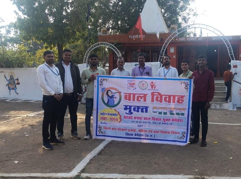 *बेमेतरा 15 जनवरी 2026:-* कलेक्टर सुश्री प्रतिष्ठा ममगाई के निर्देशन में जिले में बाल विवाह मुक्त भारत अभियान को सशक्त रूप से आगे बढ़ाया गया। कार्यक्रम का आयोजन जिला कार्यक्रम अधिकारी श्री चन्द्रबेश सिंह सिसोदिया एवं जिला महिला एवं बाल विकास अधिकारी श्री सी.पी. शर्मा के मार्गदर्शन तथा जिला बाल संरक्षण अधिकारी श्री व्योम श्रीवास्तव एवं परियोजना समन्वयक (चाइल्ड हेल्पलाइन) श्री राजेंद्र चंद्रवंशी के नेतृत्व में किया गया।इस अवसर पर बेरला विकासखंड अंतर्गत स्थित करोकन्या धार्मिक स्थल के ट्रस्टी, प्रबंधक, अध्यक्ष एवं पुजारी से मुलाकात कर बाल विवाह प्रतिषेध अधिनियम 2006 के कानूनी प्रावधानों की विस्तार से जानकारी दी गई। धार्मिक स्थल से जुड़े पदाधिकारियों से आग्रह किया गया कि किसी भी विवाह के आयोजन से पूर्व बालिका की न्यूनतम आयु 18 वर्ष एवं बालक की न्यूनतम आयु 21 वर्ष सुनिश्चित की जाए। आयु सत्यापन के दौरान आधार कार्ड को मान्य न मानते हुए केवल अंकसूची या जन्म प्रमाण पत्र के आधार पर ही आयु की पुष्टि कर विवाह संपन्न कराने हेतु निर्देशित किया गया।