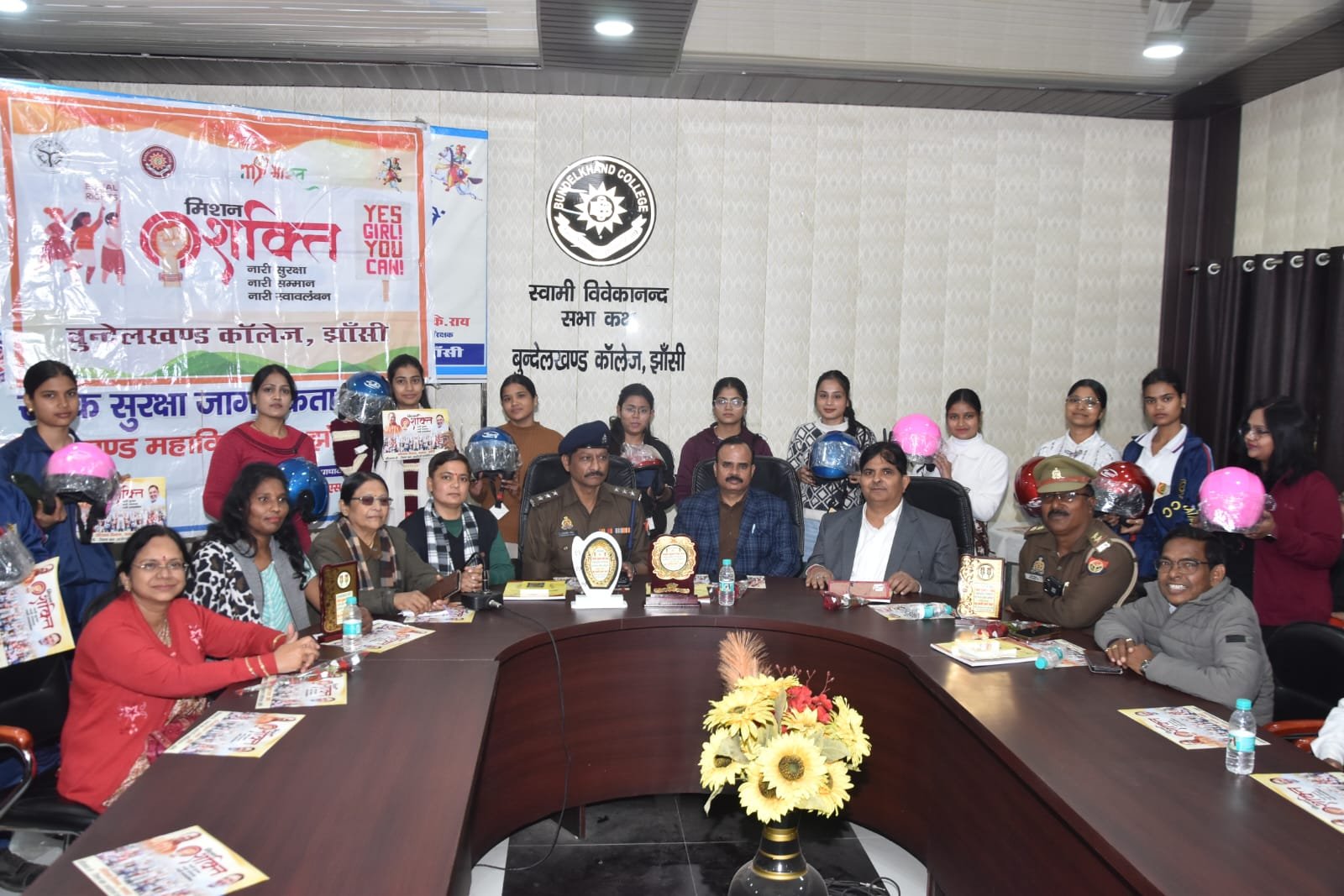 झांसी। एक और जहां सड़क हादसों का ग्राफ बढ़ता ही जा रहा है वहीं दूसरी ओर विभिन्न स्थानों पर सड़क सुरक्षा जागरूकता के कार्यक्रमों के माध्यम से लोगों को अनवरत रूप से जागरूक भी किया जा रहा है साथ ही उनका सर सुरक्षित रहे इस हेतु हेलमेट भी निशुल्क रूप से वितरित किए जा रहे हैं शासन के आदेशानुसार 1 जनवरी 2026 को सड़क सुरक्षा माह का आगाज हो चुका है साथ ही साथ वरिष्ठ पुलिस अधीक्षक ब जीटीएस मूर्ति के दिशा निर्देशन में मिशन शक्ति अभियान फेज 5.0 भी अनवरत रूप से जारी है, इसी क्रम में आज बुंदेलखंड महाविद्यालय झांसी के स्वामी विवेकानंद सभा कक्ष में सड़क सुरक्षा जागरूकता सेमिनार व मिशन शक्ति अभियान फेज 5.0 साथ-साथ चलाया गया जिसमें एक तरफ तो उपस्थित छात्र-छात्राओं को सड़क सुरक्षा के नियमों की जानकारी दी गई वहीं दूसरी ओर नारी जो परिवार व समाज की धुरी है ऐसे में मिशन शक्ति अभियान के अंतर्गत महाविद्यालय की मेधावी छात्राओं को ट्रैफिक चीफ वार्डन प्रगति शर्मा द्वारा निशुल्क हेलमेट वितरित किए गए सेमिनार में मुख्य अतिथि के रूप में ए आर टी ओ प्रवर्तन हेमचंद्र गौतम उपस्थित रहे ,सेमिनार की अध्यक्षता महाविद्यालय के प्राचार्य प्रोफेसर एसके राय द्वारा की गई विशिष्ट अतिथि के रूप सीओ सदर रामवीर सिंह, टी एस आई इंद्र बहादुर सिंह उपस्थित रहे। सेमिनार का संयोजन ट्रैफिक चीफ वार्डन व सड़क सुरक्षा समिति की सदस्य प्रगति शर्मा द्वारा किया गया।