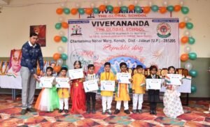 कोंच। नगर स्थित विवेकानंद द ग्लोबल स्कूल में आज भारत का 77वां गणतंत्र दिवस अत्यंत गरिमामय, देशभक्ति और उत्साहपूर्ण वातावरण में मनाया गया। कार्यक्रम का शुभारंभ प्रातः 9:00 बजे विद्यालय प्रांगण में हुआ।