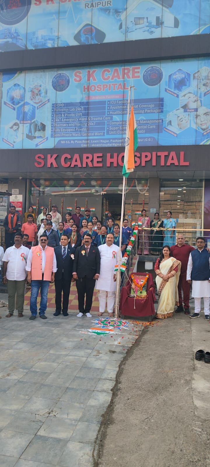 रायपुर, 26 जनवरी, गणतंत्र दिवस के अवसर पर एस के केयर हॉस्पिटल पचपेड़ी नाका रायपुर में ध्वजारोहण पश्चात राष्ट्र गान और सांस्कृतिक कार्यक्रम किया गया . उक्त कार्यक्रम हॉस्पिटल संचालक डॉ सुनील कुमार ओझा की अध्यक्षता में, अरविन्द कुमार ओझा प्रदेश अध्यक्ष वर्ल्ड ब्राह्मण फेडरेशन छत्तीसगढ़ के मुख्य आतिथ्य में, विशिष्ट अतिथि डॉ सुशील चंद्र द्विवेदी आईपीएस, ओएसडी छत्तीसगढ़ शासन एवं गुणनिधि मिश्रा, राष्ट्रीय उपाध्यक्ष वर्ल्ड ब्राह्मण फेडरेशन, एडवोकेट अरुण कुमार दुबे जी, प्रीति मिश्रा, राहुल शुक्ला, विनोद प्रधान, ललित सेठी, शरद प्रामाणिक जी, डॉ जया बाजपेई, डॉ वेदप्रकाश वर्मा आदि के सानिध्य में संपन्न हुआ. कार्यक्रम में सर्वप्रथम मां भारती के चित्र पर माल्यार्पण कर दीप प्रज्वलन मुख्य अतिथि अरविन्द कुमार ओझा, गुननिधि मिश्रा, डॉ सुशील चंद्र द्विवेदी, डॉ सुनील कुमार ओझा, प्रीति मिश्रा द्वारा किया गया एवं सभी ने सम्मान पूर्वक सावधान मुद्रा में राष्ट्र गान किया. तदोपरांत परंपरानुसार अतिथियों का पुष्पगुच्छ तथा अंगवस्त्र से स्वागत व सम्मान किया गया. सांस्कृतिक कार्यक्रम की शुरुआत देश भक्ति गीतों से किया गया. संचालक डॉ सुनील कुमार ओझा ने है प्रीत जहां की रीत सदा गीत प्रस्तुत हुआ, शीतल साहू जी ने अरपा पैरी के धार, मैनेजर ललित सेठी ने जहां डाल डाल पर, प्रीति मिश्रा ने सारे जहां से अच्छा, शरद प्रामाणिक ने संदेश आते हैं गीत गाया. कार्यक्रम के मुख्य अतिथि श्री अरविन्द कुमार ओझा जी ने अपने उद्बोधन में राष्ट्र को अंदरुनी खतरों से आगाह करते हुए देश के प्रति समर्पण की व्याख्या की तथा एस के केयर हॉस्पिटल द्वारा सैनिकों को दी जा रही मुफ्त चिकित्सा एवं अब तक आयोजित होने वाले 143 निःशुल्क हेल्थ कैंप की सराहना की जो कि एक उपलब्धि है. सुशील चंद्र द्विवेदी जी ने भारत के गौरव के विषयों पर प्रकाश डालते हुए शुभकामनाएं दी. इसी कड़ी में श्री गुननिधि मिश्रा जी द्वारा हॉस्पिटल के निशुल्क हेल्थ कैंप एवं श्रेष्ठ सेवाओं को याद किया एवं शुभकामनाएं दी. संचालक डॉ सुनील कुमार ओझा ने भारत को उत्कृष्ट भारत बनाने अपने अपने कार्य को पूरी लगन एवं ईमानदारी से करने का संदेश दिया. हॉस्पिटल की ओर से डॉ जया बाजपेई, डॉ वेदप्रकाश वर्माजी ने अपने विचारो को साझा किया एवं विनोद प्रधान, विद्या भट्ट, राहुल शुक्ला, शरद प्रामाणिक, प्रीति मिश्रा जी ने भी गणतंत्र दिवस की बधाई एवं प्रेरक उद्बोधन दिया. इस अवसर पर सेवक साहू, ललित सेठी, डॉ शालिनी श्रीवास्तव, डॉ शुभम, डॉ पूजा आहूजा, डॉ पामेश साहू, तुमेंद्र साहू, शीतल साहू, नैना, गिरजा, प्रीति भोई, नोमिका, मनीष, गीता, जालंधर, ममता आदि उपस्थित थे. अंत में सभी ने स्वल्पाहार का आनंद लिया एवं धन्यवाद 