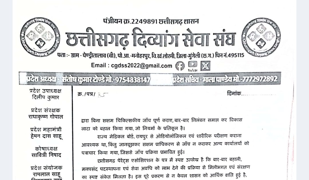 *छत्तीसगढ़ दिव्यांग संघ ने की लोक शिक्षण संचनालय में की शिकायत*