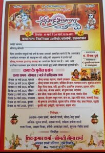 प्रेस को जानकारी देते हुए पं शिव कुमार शर्मा ने बताया कि शेष दिनों की कथा का आनंद लेने के लिए समय पर उपस्थित हो कर कथा का श्रवण करे i इस आयोजन में शर्मा परिवार की ओर से श्रीमति सीमा शर्मा, अशोक पुष्पा शर्मा, नंदनी शर्मा, नरेंद्र रेणु शर्मा, , अनिल सुमन शर्मा, आभा शर्मा, राकेश स्वेता शर्मा, लता मिश्रा, आशा मिश्रा, शौर्य, आकाश, शुभम निधि शर्मा, आदि ने कथा प्रेमियों से इस समय का लाभ उठाने अनुरोध किया है i
